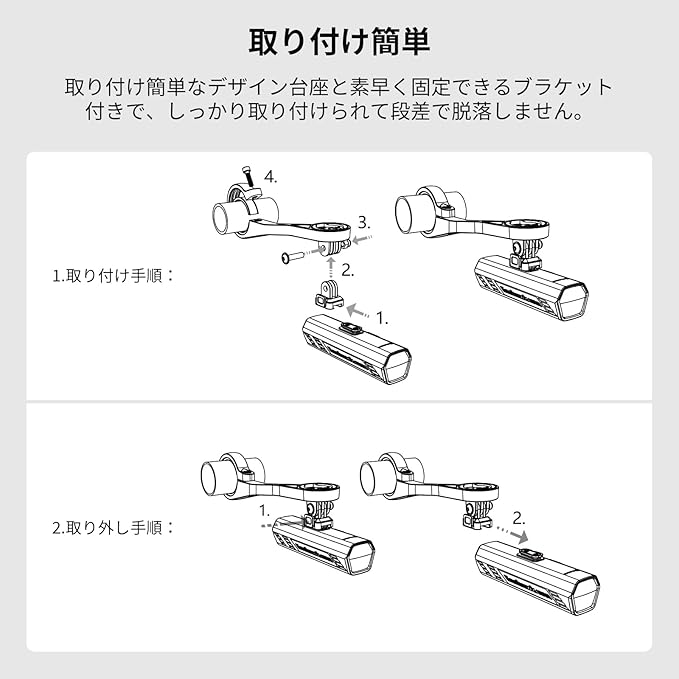 [取り付け簡単&吊り下げ式] 取り付け簡単なデザイン台座と素早く固定できるブラケット付きで、しっかり取り付けられて段差で脱落しません。また、吊り下げ式専用の自転車ライトで、サイクルコンピューターと同時に取付可能です