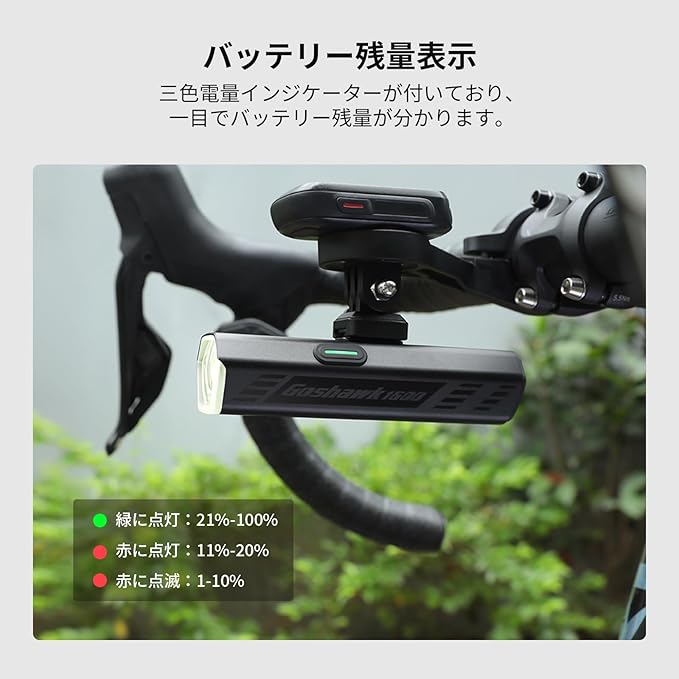 [バッテリー残量表示&IPX6防水] バッテリーインジケーターによりバッテリー残量を簡単に判断でき、突然の電源切れを心配することなく、適切なタイミングで充電できます。また、 IPX6級防水基準を備えており、日常的に防水されており、雨の日にも自転車に乗っても安心して使用することができます
