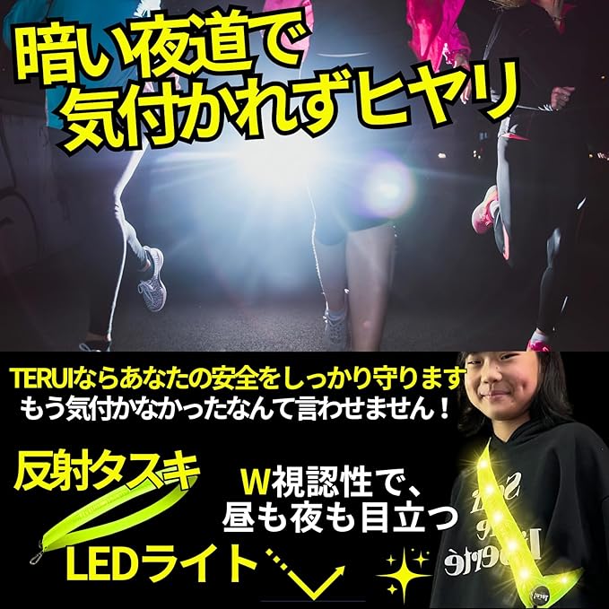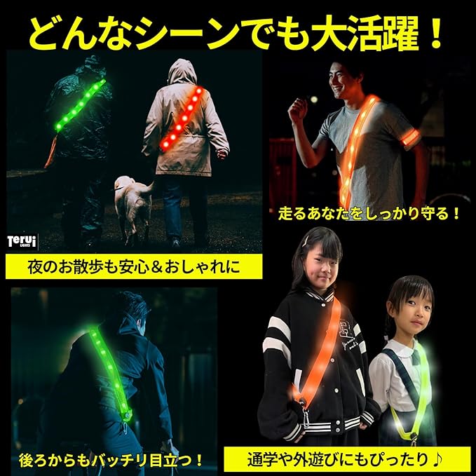 【暗闇でも光る!自発光LEDライトで視認性抜群】LEDライトが自ら発光し、暗闇でも高い視認性を確保。反射タスキとは異なり、光源がない場所でも自ら光るので事故防止に最適。実際に使用したお客様からは「車が避けてくれるようになった!」「夜道の歩きももう怖くない」と高評価をいただいています。