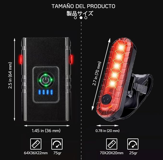 特徴: フロントライト - 6つのライトモードと1400フィート以上の光量。内蔵の調節可能な電話ホルダー。パワーバンクを搭載する機能を備え、いつでも電話を充電できます。リアライト- 4つのライトモードと360 回転可能。 1600LM。バッテリー容量:3600ランタイム:前面37時間 / 後面915.USB充電可能。 取り付け可能 - 工具不要で数秒防水 - IPX4。 アルミアルミアルミアルミ内容:フロントライト製。 1リアライト2個。 タイプCケーブル1本、マイクロUSBケーブル個。