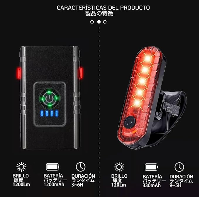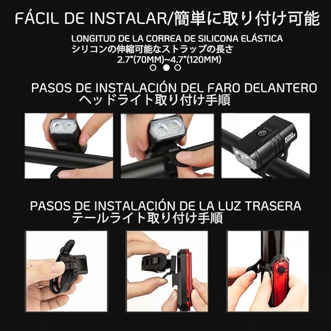【明るく長持ち】このバイクライトセットは1200ルーメンの印象的なLED光度を提供し、優れた明るさを実現します。フロントライトは1200mAhのバッテリーキャパシティで3〜6時間稼働し、リアライトは9〜15時間のランタイムがあります。