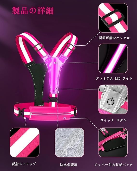 【防水収納バッグ】21cm x 6.6cm (長さ x 幅) のこの多目的な電話ホルダーは、電話、鍵、現金、カード、イヤホンなどの必需品を安全に持ち運べます。LED ランニングライトベストは、最大 3 台の 17cm 電話を収納でき、外出先でも音楽を楽しむためのヘッドホンケーブルポートが内蔵されています。さらに、防水ライニングにより、雨や霧の状況でもアイテムをドライに保ちます。