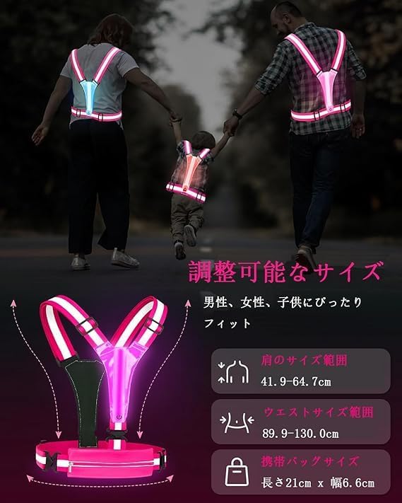 【快適で調節可能なフィット感】あらゆる体型にフィットするように設計されたこの夜間ウォーキング用ライトベストは、肩の長さを41.9~64.8 cm、ウエストサイズを90~130 cmに調節でき、快適で安全なフィット感を保証します。伸縮性と通気性に優れた素材で作られており、夜間ランニングギアの重量はわずか190 gで、着用者の快適さを最大限に高めます。