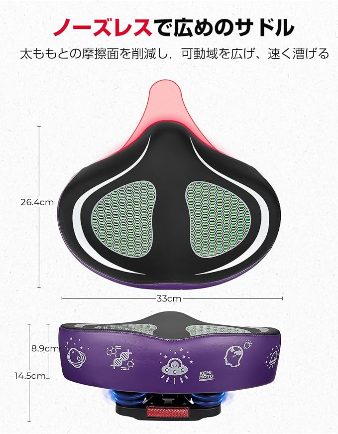 【太もも擦れ・圧痛を軽減】KEMIMOTO最新ノーズレス設計の自転車サドル登場!座面長さと前出し部分を短縮し、太ももとの接触面積を削減します。長時間のライディングでも擦れや圧迫痛を大幅に軽減し、快適な乗り心地を提供します。
