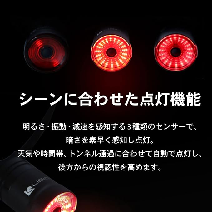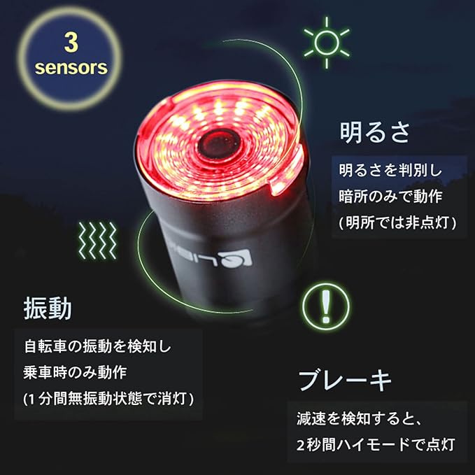 明るさ・振動・減速を感知する3種類のセンサーで、暗さを素早く感知し点灯。