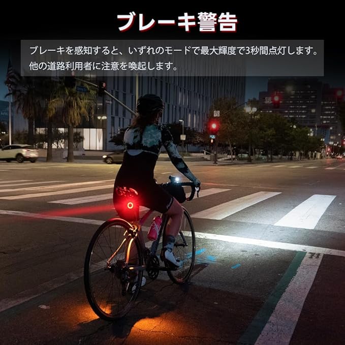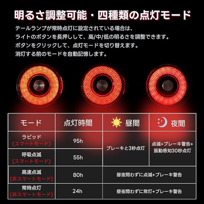 2.【ブレーキ警告+自動点滅】:スマートチップを搭載、振動検知を達する。走行中ブレーキの時最高輝度で点灯する。夕暮れ時といったシチュエーションで、自動的に点灯する。更に30秒停止以後自動消灯、相当便利。
