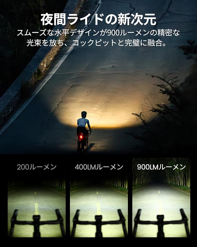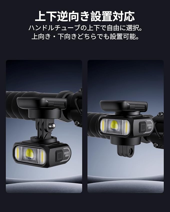 【夜間ライドの新次元&上下逆向き設置対応】スムーズな水平デザインが900ルーメンの精密な光束を放ち、コックピットと完璧に融合。ハンドルの「上」も「下」も、好みの位置にワンタッチで設置可能。工具不要!3秒で完了する簡単取り付け。