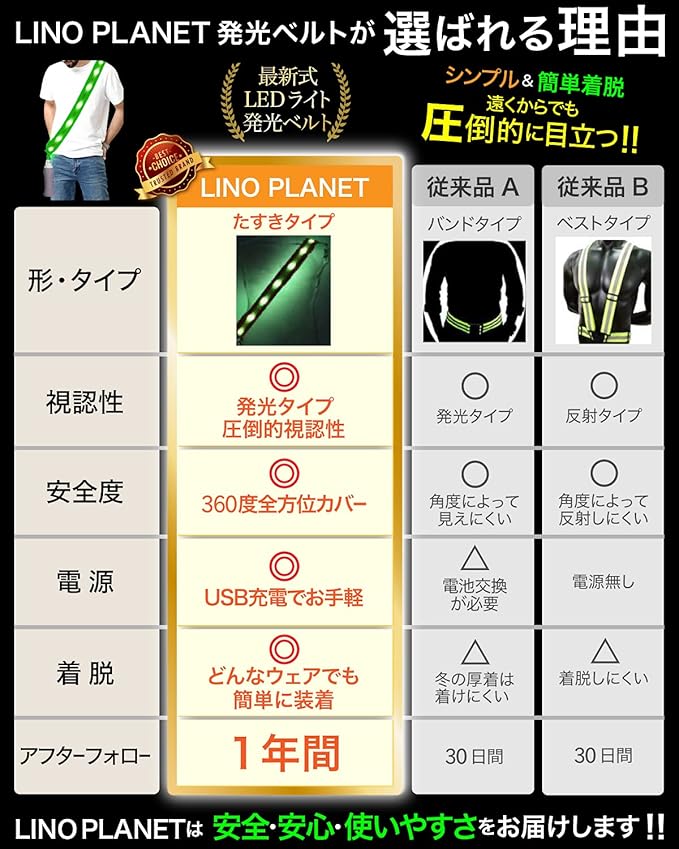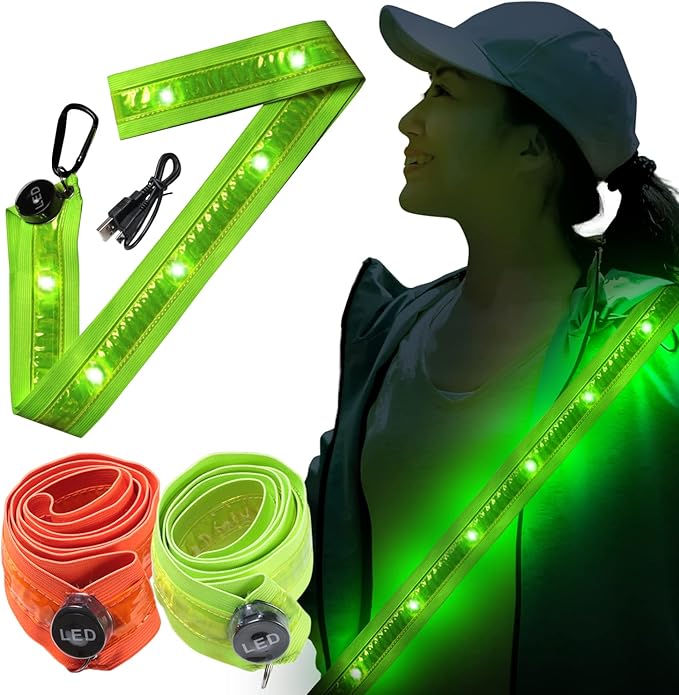 【■"反射+発光"でよく光る】光を反射するだけでなく、ベルト自体が発光する優れもののランニングライト。反射材だけのベルトは、街灯のない場所では見えにくいことも。発光式のベルトは真っ暗な場所でもちゃんと光るから、360度よく見えます。反射ベルト・反射シールよりも視認性がよく、目立って安全。