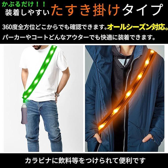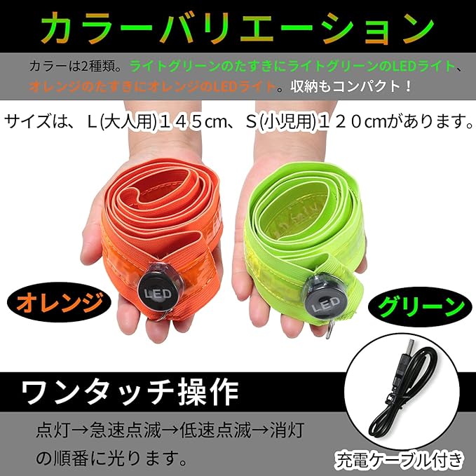 【■仕様】 ●サイズ:長さL145㎝,S120㎝(調節不可)・幅5㎝・LEDライト14個●付属品:USBケーブル・カラビナ●発光時間:点灯モード6時間、点滅モード12時間●USB充電式(60分でフル充電)●保証:通常保証(30日)・メーカー保証(1年間)※商品の管理、品質については万全を期しておりますが、万が一ご注文と異なる商品や不良品がございましたらご連絡ください。