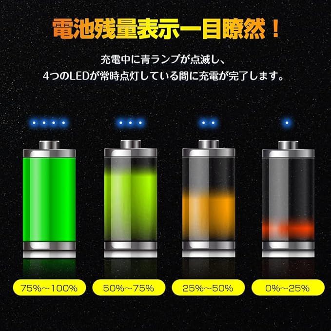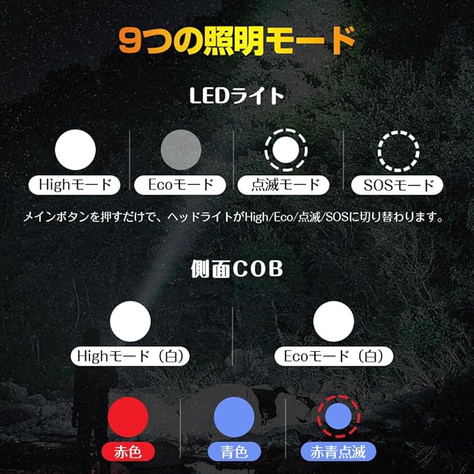 【バッテリー残量表示&9モード調光】4コマインジケーターランプは、従来のスイッチ式表示ランプよりも正確に具体的な電力量を表示したり、電池容量低下による充電必要時をお知らせしたりできます。メインスイッチを押すと高輝度-中輝度-sos-点滅-OFFの4つのヘッドライトモードを切り替えます。COB作業灯を長押すと白ランプの高輝度-COB白ランプの低輝度-OFF&COB赤信号-COB青信号-COB赤青点滅-OFFの5つの照明モードがオンになり、各種の暗い環境に簡単に対応できます。