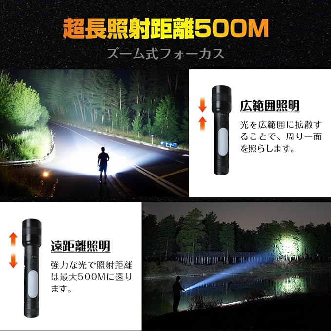 【フォーカス調整機能&耐久性・高品質IP56防水防塵】懐中電灯のヘッド部分はを回して、ズーム機能が可能です。光束を広くから狭くして、最大500メートル遠くの物体に焦点を合わせます。拡大して180度広い物体領域を照らすこともできます。軍用超高硬度のアルミ合金を採用され、本体頑丈で耐衝撃性に優れ、防災や自衛などに使用可能です。日常生活の雨水などによる水滴の付着や飛沫程度なら、懐中電灯本体に悪影響なく耐えることができます。(水に浸さないでください)。アウトドア・キャンプ・登山・防犯・防災・地震対策・停電時などに大活躍しています。