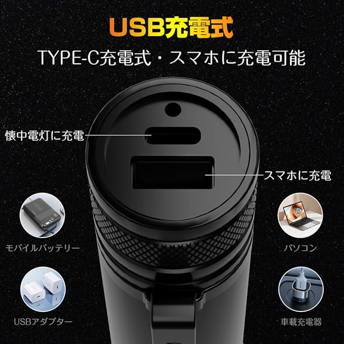 【TYPE-C充電式双方向&3000mAh大容量18650電池】内蔵のUSB入力ポートに付属のUSB充電ケーブルで懐中電灯へ充電でき、USB出力ポートに携帯電話やパソコンなどに電力がない緊急時には、モバイル電源として使えます。総寿命は約100,000時間で、循環充電が可能な大容量18650電池が付属して、フル充電の場合、最小モードで約12時間の連続使用ができ、最大モードでも約5時間の連続使用ができます。ご注意:電池内蔵、交換できない。