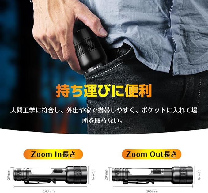【超高輝度LED&コンパクトデザイン】新機種超高輝度LED懐中電灯は最大10000ルーメンの明るさを実現、最大照射距離は500メートルに達し、周囲の暗闇を切り開き、夜間であっても昼間のように感じられます。また小さくて軽量な外形を備えており、直径わずか3.6cm、長さ14.8cm、重さはたったの152グラムです。手のひらサイズで持ち運びが非常に便利です。携帯用クリップ付属し、持ちやすいです。帽子にかぶり、ポケットに入れたり、キーホルダーで腰にぶら下げたりすることもできます。