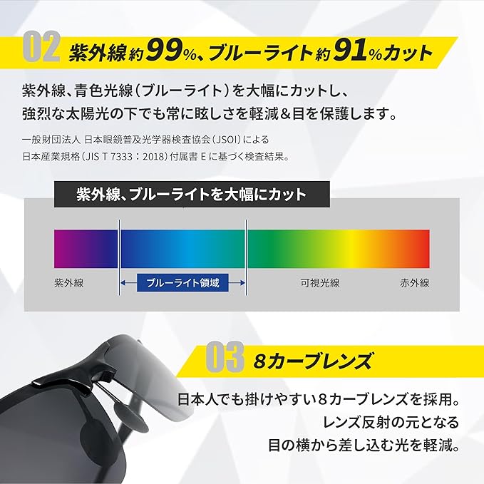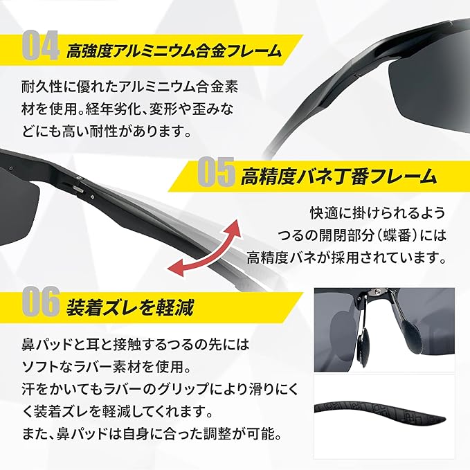 【偏光度90%超の偏光レンズ】日本産業規格(JIS規格)において求められる偏光サングラスの基準である「偏光度90%以上」を超えるレンズを採用することによりアウトドア、スポーツ、ドライブなど多岐にわたるシーンで快適にご使用可能。 【ブルーライト約91%カット】眼に有害とされる青色光線を大幅にカットすることにより屋外の強烈な太陽光の下でも常に目を保護します。一般財団法人 日本眼鏡普及光学器検査協会(JSOI)による日本産業規格(JIS T 7333:2018)付属書Eに基づく検査結果。 【高強度アルミニウム合金フレーム】フレーム枠には耐久性に優れたアルミニウム合金素材を使用することで経年劣化、変形や歪みなどにも高い耐性を持ち合わせており長年ご愛用頂くことが可能。 【調整可能なソフトラバーモダン&鼻パッド】耳と接触するつる先と鼻パッドにはやわらかいラバー素材を使用しておりご自身に合った角度に調整が可能。また、汗をかいてもラバーのグリップにより滑りにくく装着ズレを軽減します。 【高精度バネ丁番フレーム】顔の大きい方でも快適に掛けられるようつるの開閉部分(蝶番)には高精度バネが採用。