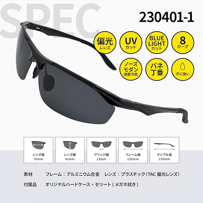 【商品情報】 ▪️フレームスペック 型番:230401-1 素材:アルミニウム合金 フレーム幅:150mm レンズ幅:70mm ブリッジ幅:12mm テンプル長:131mm ▪️レンズスペック 素材:プラスチック(TAC偏光レンズ) レンズ横幅:70mm レンズ縦幅:41mm ブルーライトカット率:約91%(JIS規格) 紫外線カット率(UVカット):99%以上 可視光線透過率:約9% 偏光度:90%以上 【新品未開封】丁寧に梱包し発送いたします。 【偏光度90%超の偏光レンズ】日本産業規格(JIS規格)において求められる偏光サングラスの基準である「偏光度90%以上」を超えるレンズを採用することによりアウトドア、スポーツ、ドライブなど多岐にわたるシーンで快適にご使用いただけます。 【ブルーライト約91%カット】眼に有害とされる青色光線を大幅にカットすることにより屋外の強烈な太陽光の下でも常に目を保護してくれます。一般財団法人 日本眼鏡普及光学器検査協会(JSOI)による日本産業規格(JIS T 7333:2018)付属書Eに基づく検査結果。 【高強度アルミニウム合金フレーム】フレーム枠には耐久性に優れたアルミニウム合金素材を使用することで経年劣化、変形や歪みなどにも高い耐性を持ち合わせており長年ご愛用頂くことが可能です。 【調整可能なソフトラバーモダン】耳と接触するつる先にはやわらかいラバー素材を使用しておりご自身に合った角度に調整が可能です。また、汗をかいてもラバーのグリップにより滑りにくく装着ズレを軽減してくれます。 【ソフトラバー鼻パッド】鼻と接触するパーツにはやわらかいラバー素材使用することにより長時間の着用でも快適です。また、汗をかいてもラバーのグリップにより滑りにくく装着ズレを軽減してくれます。 【調整可能な鼻パッド】鼻パッドの位置をご自身に合わせて調整することが可能で、より自身に合ったフィッティングを実現してくれます。 【高精度バネ丁番フレーム】顔の大きい方でも快適に掛けられるようつるの開閉部分(蝶番)には高精度バネが採用されています。 【8カーブレンズ】日本人でも掛けやすい8カーブレンズを採用することによりレンズ反射の元となる目の横から差し込む光を軽減してくれます。 【ストレートテンプル】帽子やキャップと一緒に装着しても快適なストレートテンプルを採用しています。