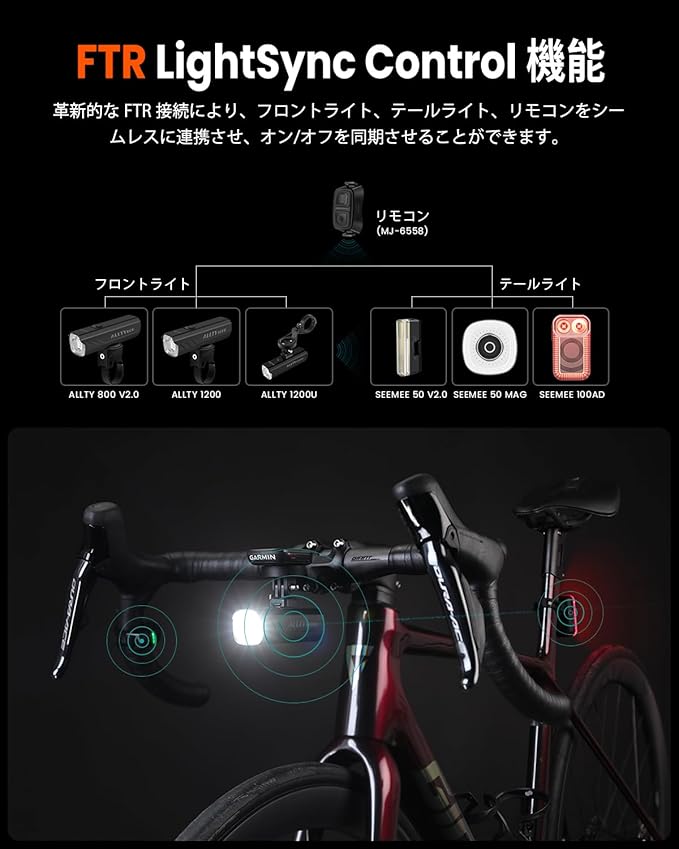 【FTR LightSync Control 機能】革新的な FTR 接続により、フロントライト、テールライト、リモコンをシームレスに連携させ、オン/オフを同期させることができます。(※本機能をご利用になる場合は、対応機種であるALLTY 800 V2.0/1200UライトとMJ-6558リモコンの組み合わせが必要です。)