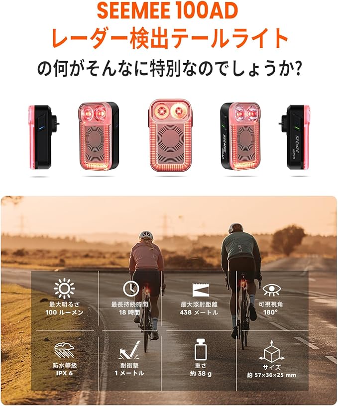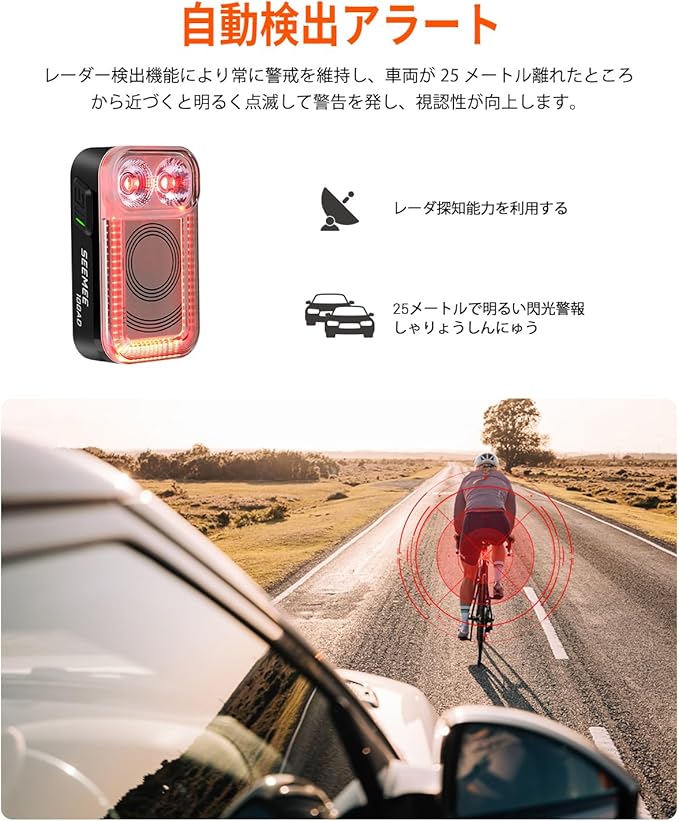 【100 ルーメン・レーダー自動検出保護】25m先の接近車両を自動検知! 危険を察知すると強力点滅で警告し、サイクリングの安全性を革新します。