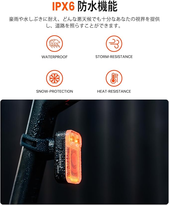 【IPX6防水】自転車テールライトは豪雨や水しぶきにも強く、悪天候でも確実に視界を確保。雨の日も安心の耐水性設計で、どんな天候でも光が途切れることはありません。