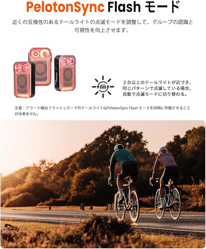 【PelotonSync Flash モード】グループライドに最適!近くの互換テールライトと連動して点滅モードを自動調整し、仲間との一体感と安全性を高めます。