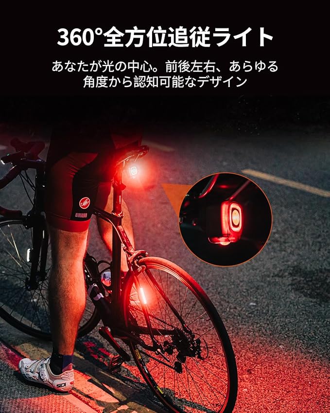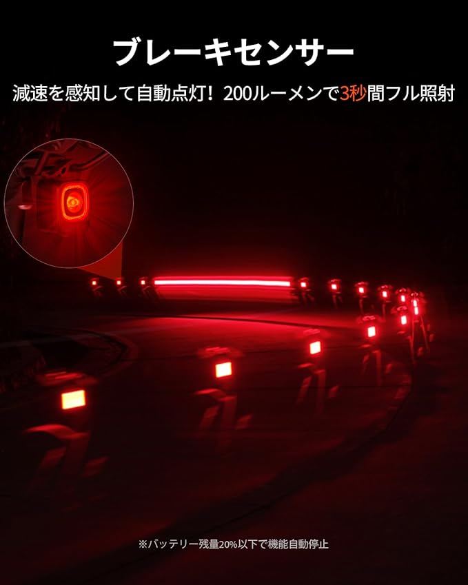 【自動消灯/点灯・ブレーキ警告機能】高感度インテリジェントセンサーチップ搭載。センサーがブレーキの動き(G)を検知すると、約3秒間200ルーメンの最大輝度で自動点灯し、後続車に減速を警告。昼夜を問わず、すべての点灯モードで対応可能です。(※ブレーキセンサー作動時は、連続動作時間が大幅に短縮されます。)