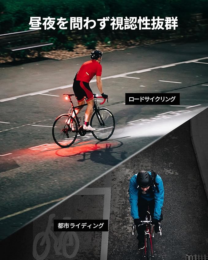 【360度可視性・高輝度安全設計】赤い警告灯が自転車の真下にLED光を照射。地面を広範囲に照らし、夜間走行の安全性を確保します。