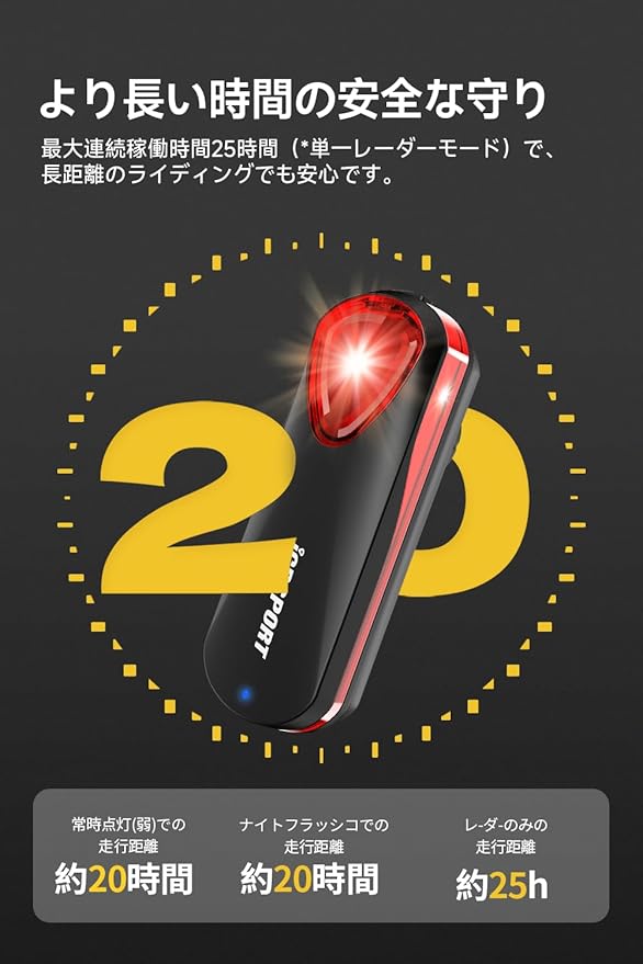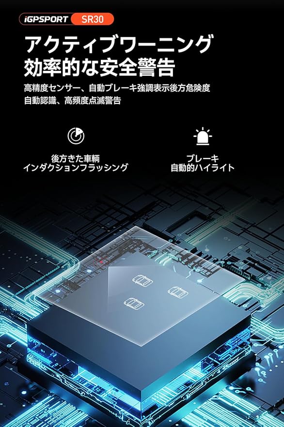 【インテリジェントリマインダー】SR30自転車テールライトは、高精度センサーを内蔵しており、ブレーキ時に自動的にライトがハイライトされます。後方から車両が接近した場合、表示端末を通じてライダーに視覚および聴覚で警告を行います。また、220 の範囲内で、1マイル以内に接近する車両に対して高頻度のフラッシュで警告を行います。