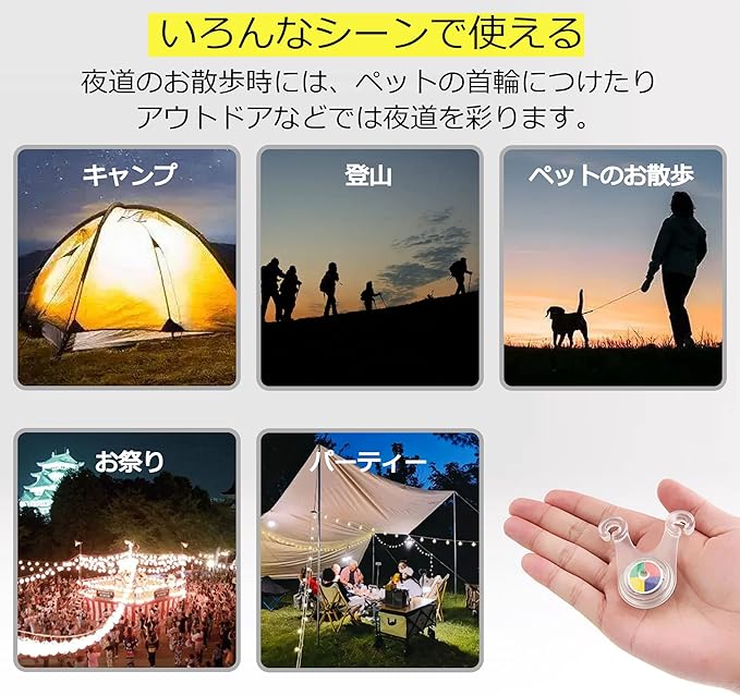 ★【いろんなシーンで活躍】 手のひらサイズなので、荷物を減らしたい時にも便利に使えます。 ロープライトだけではなく、結婚式、ホームパーティー、祭り、フェスやライブ、ペットの散歩、夜サイクリング、夜ウォーキングなどにも、色々な場面で活躍してくれます。