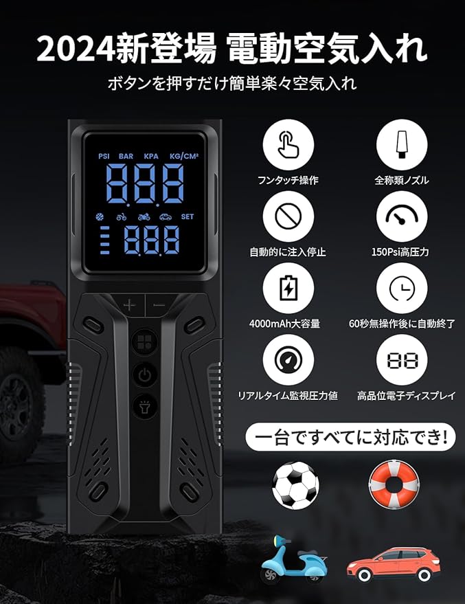 【多様な対応性:4種類のエアノズル】本製品には4種類のノズルが付属しており、様々な対象に使用することができます。さまざまなボール、浮き輪、自転車、バイクから自動車まで、この製品を使用して空気を入れることができ、非常に広範な実用性を備えている。自動車、バイク、自転車、ボールなどのモードを選択すると、手動で値を設定する必要がなく、システムが最適な充填圧力を自動で設定します。必要に応じて圧力を調整することも可能です。※異なるモデルの自転車バルブの内径が異なるため、実際の状況に応じて適切な内径を選択してください。