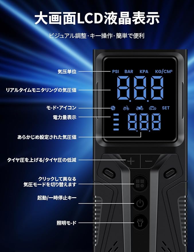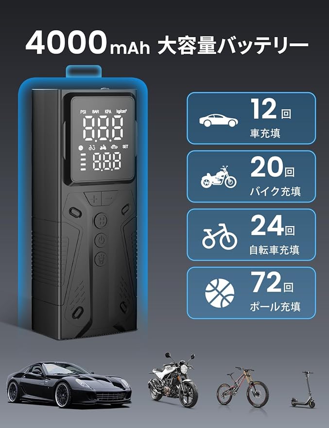 【精密タイヤ圧測定&自動停止機能】このエアコンプレッサーは、タイヤの圧力を正確に測定し、設定圧力に達すると自動的に停止します。電動空気入れ最大圧力150PSI、36PSI(自動車)、32PSI(オートバイ)、30PSI(自転車)など、全ての車種に対応可能で、正確な空気圧管理を簡単に行えます。空気圧を見やすい大画面ディスプレイで表示し、4種類の単位に対応。
