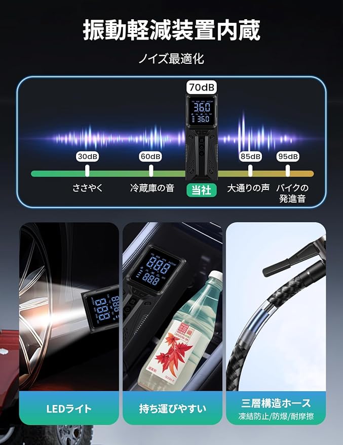 【応急照明&スマート冷却システム】夜間の作業でも安心して使えるLEDライト付きで、暗闇でもタイヤ充填や作業を安全に行える 電動空気入れ となり、応急時の照明機能を備え、緊急時や暗い場所での使用に便利です。高性能エンジンと冷却システムを採用し、長時間の使用でも過熱を防ぎ、安全に作業を続けることができます。