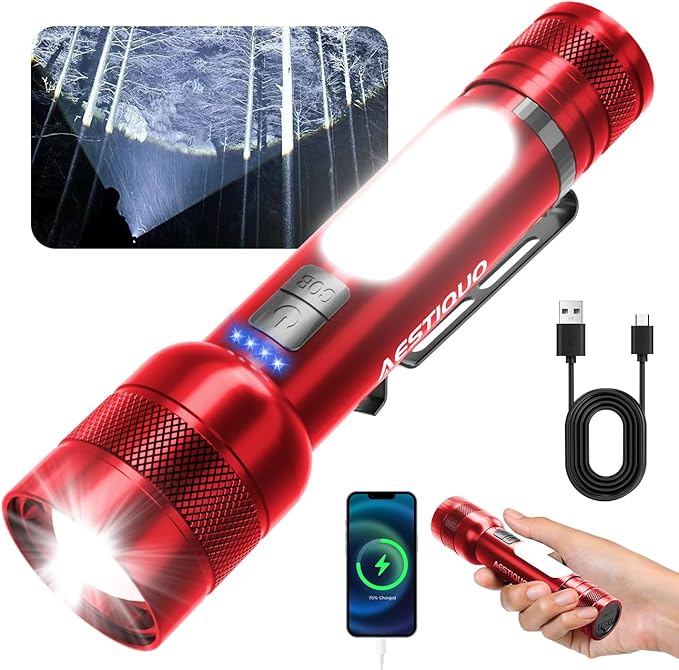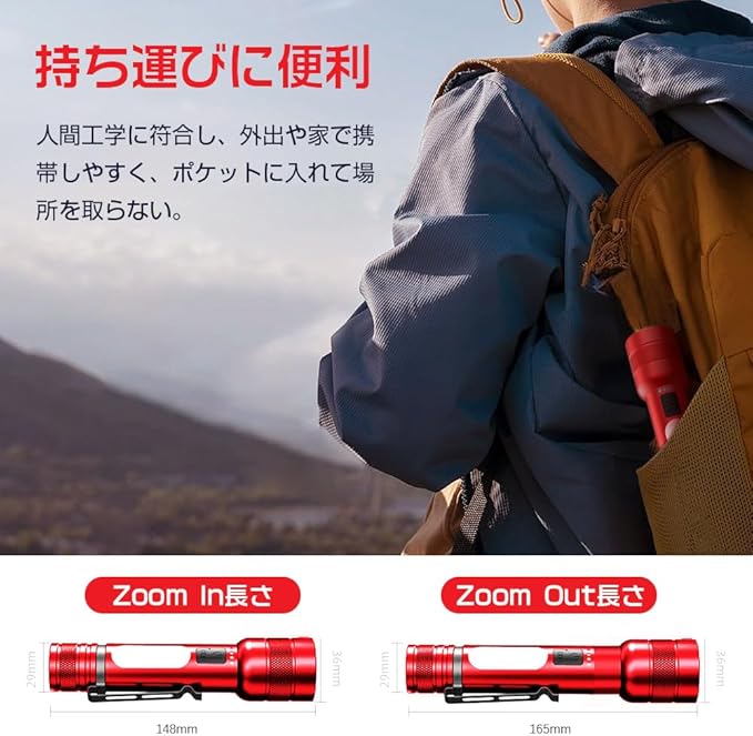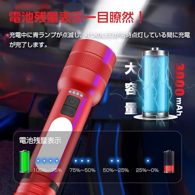 AESTIQUO 超高輝度 懐中電灯 小型 COB作業灯付き 9モード調光 25000ルーメン 2600mAh Type-C USB充電式 IP56防水防塵 軽量 ハンディライト 大容量 強力 最強 LED 高輝度 フラッシュライト ズーム式 アルミニウム合金 耐衝撃2M 新型 明るい 残量表示機能 自転車 登山 夜釣り 夜間訓練 作業用 停電 防災 地震 避難対策 日本語取扱説明書 (レッド) | KAZESHOP