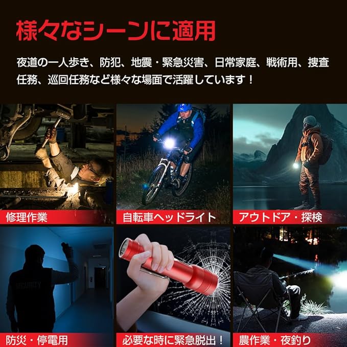 【高品質IP56防水防塵】軍用超高硬度のアルミ合金を採用され、本体頑丈で耐衝撃性に優れ、防災や自衛などに使用可能です。日常生活の雨水などによる水滴の付着や飛沫程度なら、懐中電灯本体に悪影響なく耐えることができます。(水に浸さないでください)。アウトドア・キャンプ・登山・防犯・防災・地震対策・停電時などに大活躍しています。