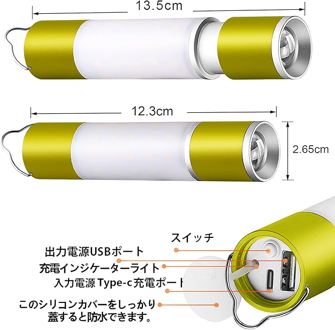 【Type-C充電式双方向& アウトドア用ライト】2600mAh充電式のリチウムバッテリーが内臓、付属のType-Cケーブルで直接に充電することができます。ユニークな充電デザイン、USBポートを水埃から守ります。緊急の場合モバイル電源としても使用できます、 は携帯電話や他の電子機器の充電ができます。