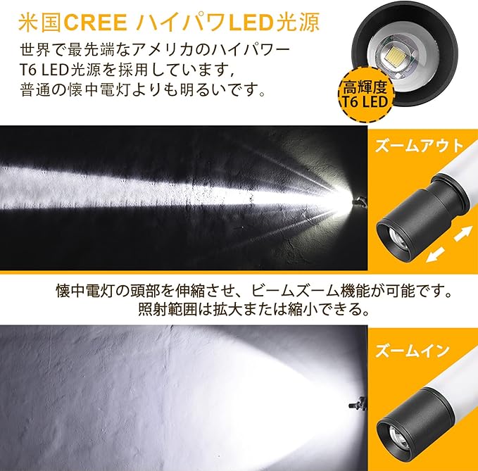 【バージョンアップの6つモード切り替えの伸縮式フォーカス】片手で簡単にスイッチを制御できて、初心者でもストレス無く快適にご使用いただけます。1回押すと点灯し、6つの照明モード(懐中電灯高輝度 → 懐中電灯低輝度 → ランタン昼白色高輝度 →ランタン昼白色低輝度 → ランタン電気色高輝度 → ランタン電気色低輝度→off)をすばやく切り替えることができます。伸縮式ズームレンズなので、照射範囲を広げたり、狭めたりすることができます。素早く消灯機能を特別に追加しました 。 どのモードでも10秒以上維持したら、スイッチに触れるだけでライトをすばやく消灯できます、電源を3秒長押して消灯します。周期的な切り替えは不要です。