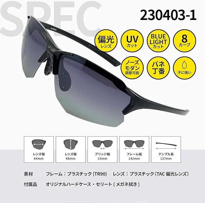 【商品情報】 ▪️フレームスペック 型番:230403-1 素材:プラスチック(TR90) フレーム幅:142mm レンズ幅:64mm ブリッジ幅:15mm テンプル長:127mm ▪️レンズスペック 素材:プラスチック(TAC偏光レンズ) レンズ横幅:64mm レンズ縦幅:48mm ブルーライトカット率:約84%(JIS規格) 紫外線カット率(UVカット):99%以上 可視光線透過率:約13% 偏光度:90%以上 【新品未開封】丁寧に梱包し発送いたします。 【偏光度90%超の偏光レンズ】日本産業規格(JIS規格)において求められる偏光サングラスの基準である「偏光度90%以上」を超えるレンズを採用することによりアウトドア、スポーツ、ドライブなど多岐にわたるシーンで快適にご使用いただけます。 【ブルーライト約84%カット】眼に有害とされる青色光線を大幅にカットすることにより屋外の強烈な太陽光の下でも常に目を保護してくれます。一般財団法人 日本眼鏡普及光学器検査協会(JSOI)による日本産業規格(JIS T 7333:2018)付属書Eに基づく検査結果。 【グラデーションレンズ】レンズの上方から下方にかけて徐々に色が薄くなるグラデーションレンズを採用することにより、空から降り注ぐ強い光は効率的に遮断し足元は暗すぎて視界が悪くならないよう設計されています。 【高強度TR90樹脂フレーム】通常のプラスチックよりも軽く且つ高強度で劣化もしにくいTR90樹脂を採用することにより安心して長くご愛用いただけます。 【構造バネ丁番フレーム】つるの開閉に適度なテンションを設けることにより使用とともに緩くなりつるが自然と開いてくることを軽減してくれます。 【軽量フィッティング】激しく動くスポーツにも対応したフィッティング設定で軽い掛け心地にもかかわらずズレにくい商品設計となっています。 【二次成型ソフトラバーモダン】耳と接触するつるの先にはやわらかいラバー素材を使用しており、汗をかいてもラバーのグリップにより滑りにくく装着ズレを軽減してくれます。 【ソフトラバー鼻パッド】鼻と接触するパーツにはやわらかいラバー素材使用することにより長時間の着用でも快適です。また、汗をかいてもラバーのグリップにより滑りにくく装着ズレを軽減してくれます。 【調整可能な鼻パッド】鼻パッドの位置をご自身に合わせて調整することが可能で、より自身に合ったフィッティングを実現してくれます。 【8カーブレンズ】日本人でも掛けやすい8カーブレンズを採用することによりレンズ反射の元となる目の横から差し込む光を軽減してくれます。 【ストレートテンプル】帽子やキャップと一緒に装着しても快適なストレートテンプルを採用しています。