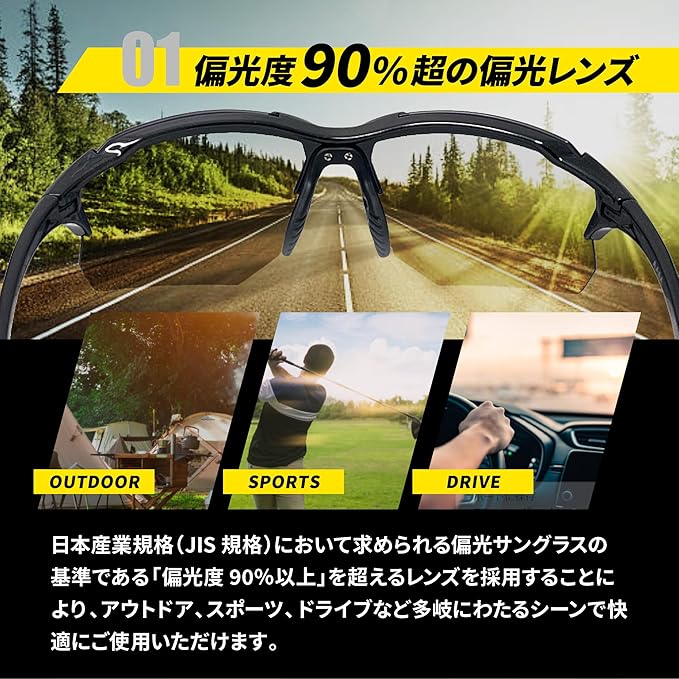 日本産業規格(JIS規格)において求められる偏光サングラスの基準である「偏光度90%以上」を超えるレンズを採用することによりアウトドア、スポーツ、ドライブなど多岐にわたるシーンで快適にご使用いただけます。眼に有害とされる青色光線を大幅にカットすることにより屋外の強烈な太陽光の下でも常に目を保護してくれます。一般財団法人 日本眼鏡普及光学器検査協会(JSOI)による日本産業規格(JIS T 7333:2018)付属書Eに基づく検査結果。 レンズの上方から下方にかけて徐々に色が薄くなるグラデーションレンズを採用することにより、空から降り注ぐ強い光は効率的に遮断し足元は暗すぎて視界が悪くならないよう設計されています。 通常のプラスチックよりも軽く且つ高強度で劣化もしにくいTR90樹脂を採用することにより安心して長くご愛用いただけます。 つるの開閉に適度なテンションを設けることにより使用とともに緩くなりつるが自然と開いてくることを軽減してくれます。 激しく動くスポーツにも対応したフィッティング設定で軽い掛け心地にもかかわらずズレにくい商品設計となっています。