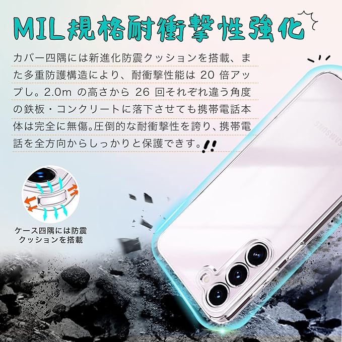 【MIL規格耐衝撃性強化】四角内部に防振クッションを搭載され、四角外部には物理耐衝撃構造設置することで、衝撃吸収性能を倍アップ!側面から落下しても角落ちしてもPhone をしっかりと守れます。2.0mの高さから26回それぞれ違う角度の鉄板・コンクリートに落下させても携帯電話本体は完全に無傷。圧倒的な耐衝撃性を誇り、ギャラクシーS23を全方向からしっかりと保護できす。