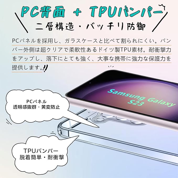 【対応機種】Galaxy S23 SC-51D SCG19(6.1インチ用)に適応しています。他のデバイスには対応しておりませんので、ご注文の際はご注意ください。ケース驚きほどの透明感、美しさをしっかりキープ、Phone本体のカラーを活かせて。