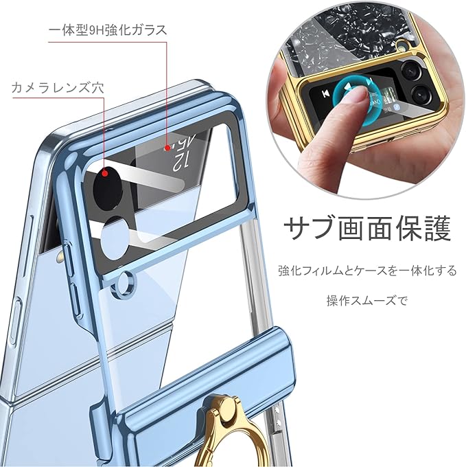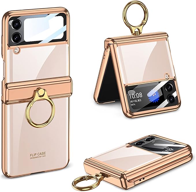 Galaxy Z Flip4 クリア ケース ヒンジ保護 Samsung ギャラクシーZ フリップ 4 5G / docomo SC-54C / au SCG17 用 カバー リング付き スタンド機能 Uovon スマホケース 背面に保護フィルム付き ストラップ穴付き メッキ 超軽量 超薄型 おしゃれ ゴールド | KAZESHOP