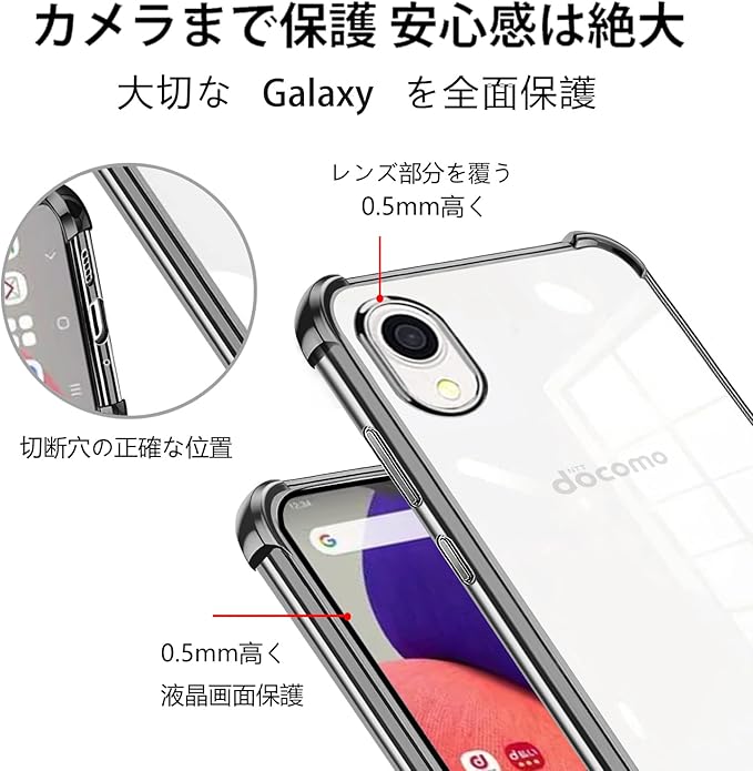 【 高い透明度 】 ケースは特別に開発されたハイテクTPU素材で作られています。 透明度が高く、本体の鮮やかな色をそのまま映し出すことができ、Galaxy A22 /SC-56B のオリジナルのカラーを損ねません。ケースの端はダイヤモンドカットプロセスを施すことでより洗練された美しい外観となっています。ケースは、型どりを緻密に実施しており、Galaxy A22を保護しているのです。これは Galaxy A22 /SC-56B の Qiワイヤレス充電 と 指紋認証 を完全にサポートします。