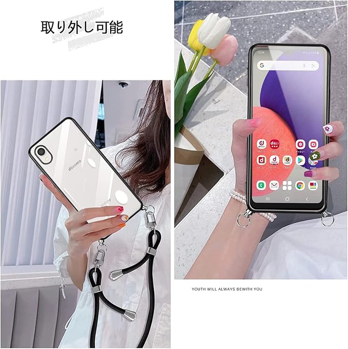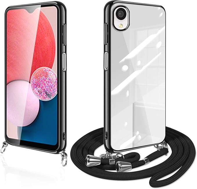 Galaxy A23 5G ケース クリア ショルダー SC-56C SCG18 スマホケース 透明 TPU カバー ストラップ付き 肩掛け 首掛け 紐付き 斜めがけ 薄型 耐衝撃 シリコン メッキ加工(ブラック) | KAZESHOP