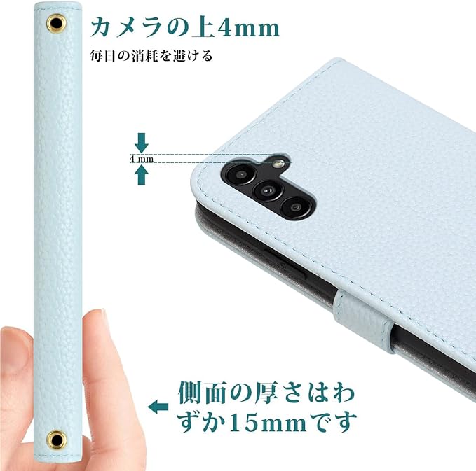 【耐衝撃性】耐熱性と柔軟性を誇るPUレザーから作られていて、滑りにくく、指紋、油分などもつきにくく、手帳型ならではの全面保護機能でディスプレイはもちろん、背面もしっかりガードします。さらにカメラレンズ保護構造でスマホ本体を傷から360度しっかり保護してくれます。