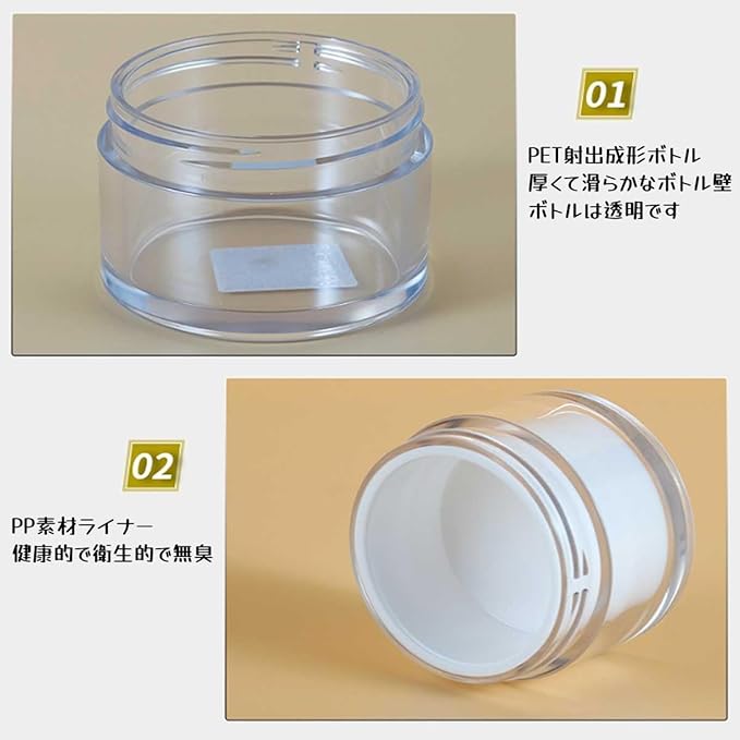 【素材】: 高品質のプラスチック製で、丈夫で耐久性があり、長期間使用しても割れたり壊れたりしません。安全で無毒なので、漏れを効果的に防ぎ、安心してフェイシャルクリームなどを保管できます。