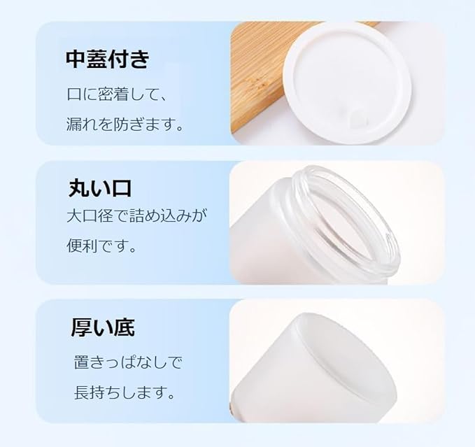 【使用上の注意】:このすりガラスクリームボトルは乳液、フェースクリーム、アイクリーム、ハンドクリームなどを取り分けることができます。簡単に水ですすぐだけで、何度も繰り返し使えます。密閉効果が高く、実用的で便利です。ガラス製で、加工中に粉塵が付く可能性がありますので、使用前に簡単な洗浄と消毒をお勧めします。