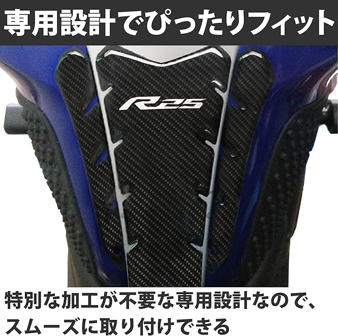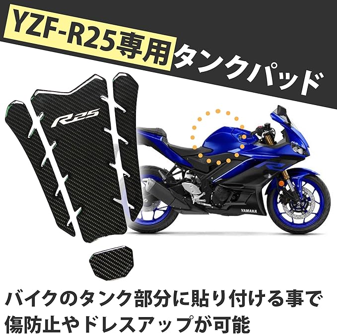 YZF-R25専用のバイク用タンクパッド:バイクのタンク部分に取り付けて傷などを防止することができるYZF-R25専用のバイク用タンクパッドとなっております。ドレスアップをしたい場合にもおすすめといえます。