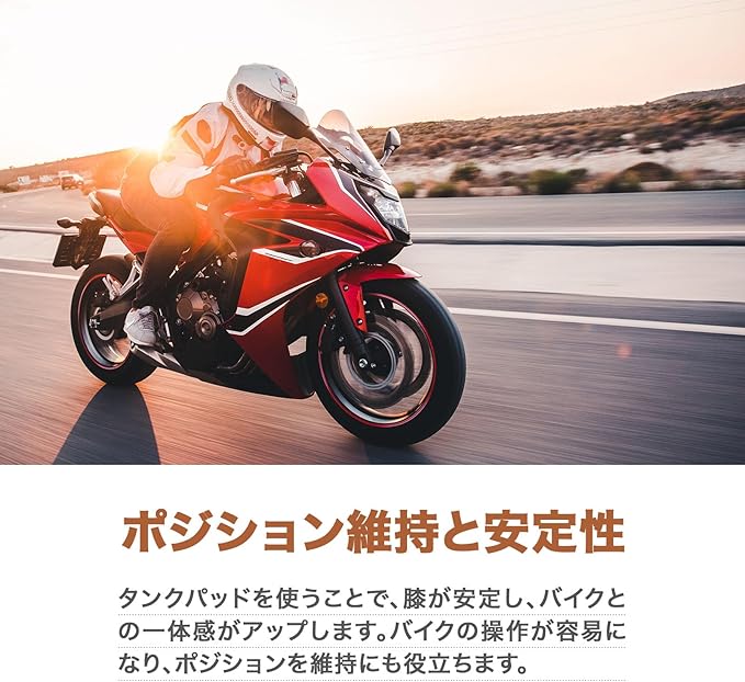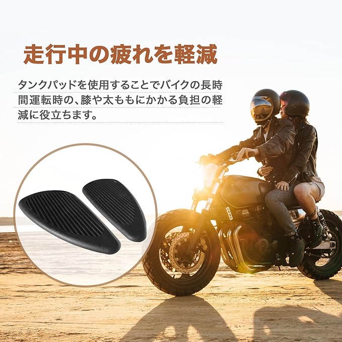 走行中の疲れを軽減:タンクパッドを使用することでバイクの長時間運転時の、膝や太ももにかかる負担の軽減に役立ちます。