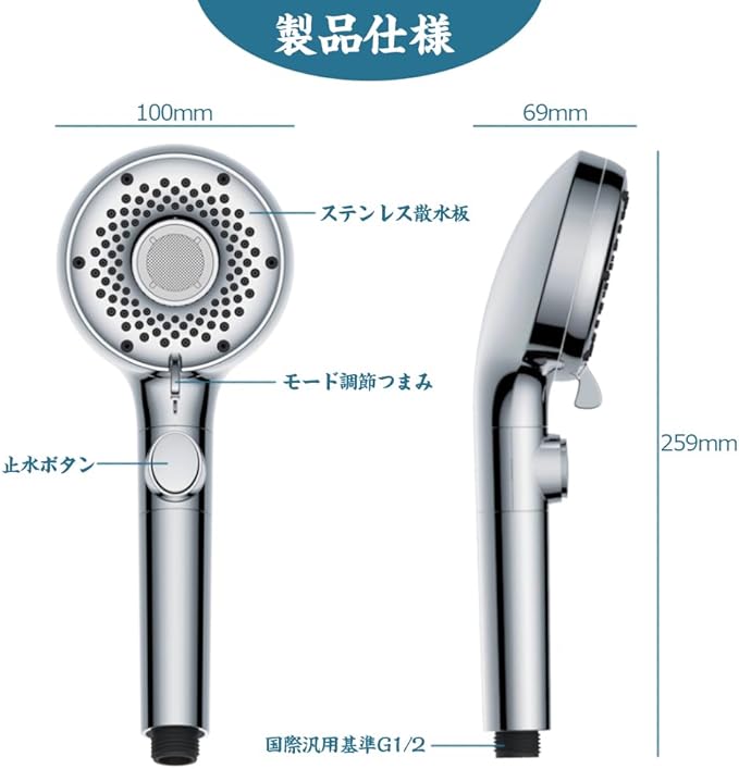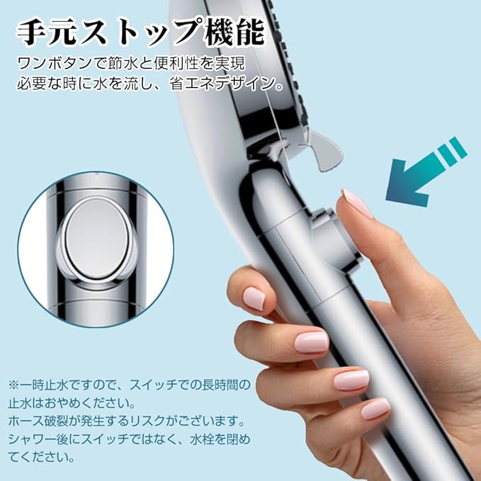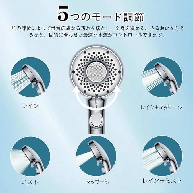 【5段階モード】5つのモードを切り替えで、ニーズに応じた最適な水流を提供し、低水圧時に約40%、中水圧時に約70%、高水圧時には最大90%の節水を実現し、経済的で肌に優しいシャワーヘッドです。