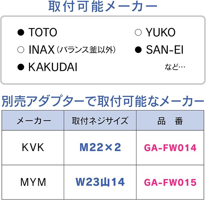 取付ネジはG1/2。KVK・MYMの場合は、別途アダプターをお買い求めください。