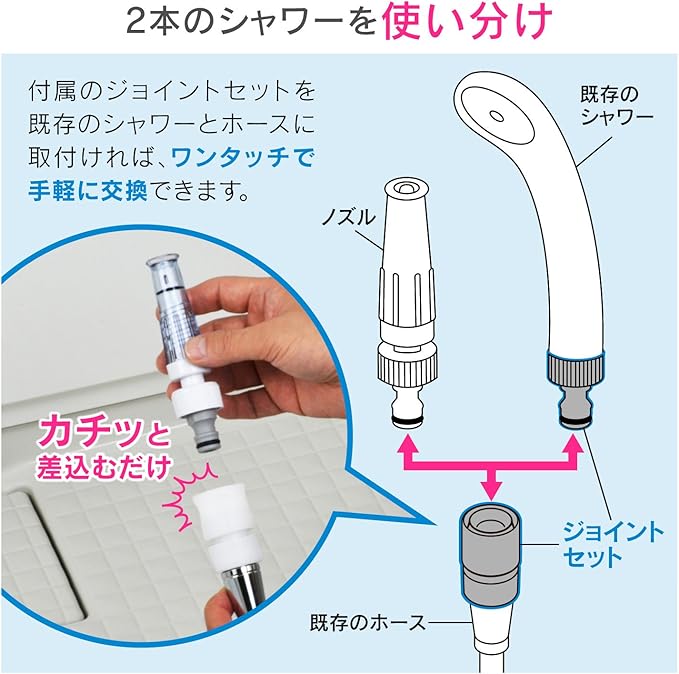 ワンタッチでシャワーを交換できるので、用途に合わせて普段使いのシャワーと使いわけ可能。