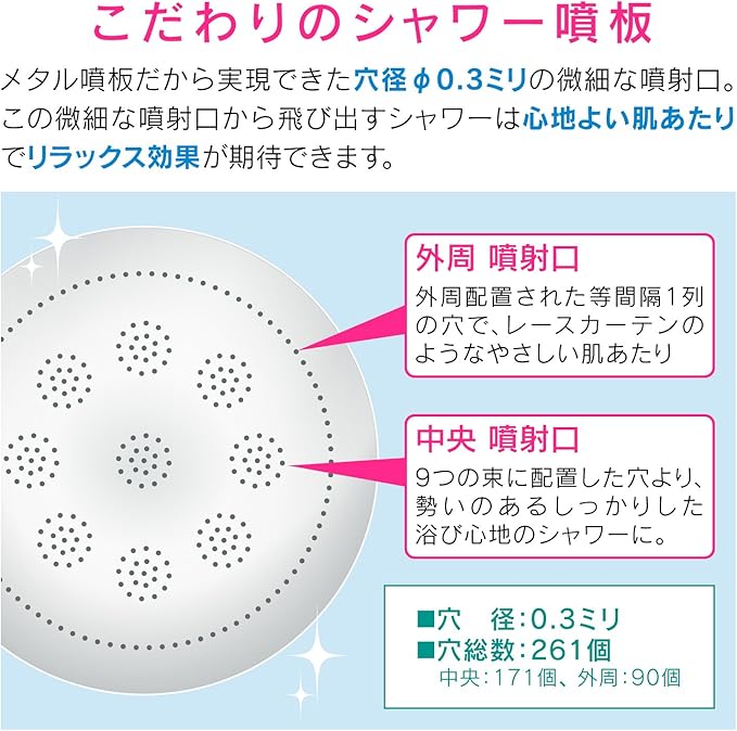 ・直径0.3mmの金属噴板の穴から飛び出す微細シャワーは、今までにないやさしい浴び心地を実現